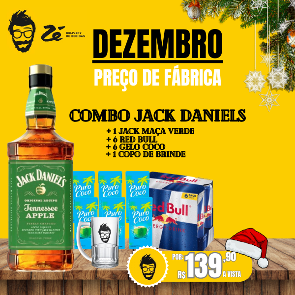 Experimente o equilíbrio perfeito entre intensidade e refrescância com o Combo Jack Daniels. Incluindo 1 Jack Daniel's Maçã Verde, 6 latas de Red Bull, 6 unidades de Gelo Coco e 1 copo exclusivo de brinde, este combo é ideal para festas e encontros inesquecíveis.